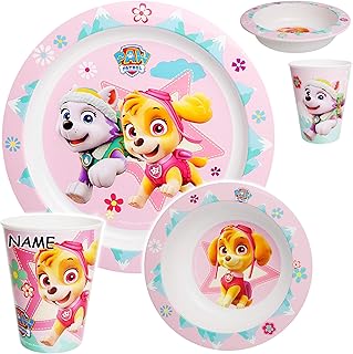 alles-meine.de GmbH 3 TLG. Geschirrset - Paw Patrol - Hunde - Everest & Skye - inkl. Name - Kunststoff - mikrowellengeeignet - BPA frei - Trinkbecher + Teller + Müslischale - Kin..