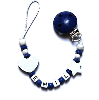 Baby Schnullerkette mit Perlen aus Holz - EMIL. Blau mit Herz und Sternchen