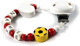 Baby Schnullerkette mit Perlen aus Holz und Wunschname. Rot weiß (Clara)