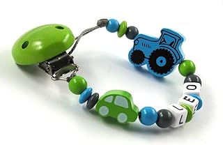 Schnullerkette mit Namen Junge Holz Auto Trecker bzw Traktor - grün - blau - grau - Baby Geschenk -
