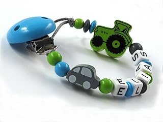 Schnullerkette mit Namen Junge Holz Auto Trecker bzw Traktor - blau - grün - grau - Baby Geschenk -